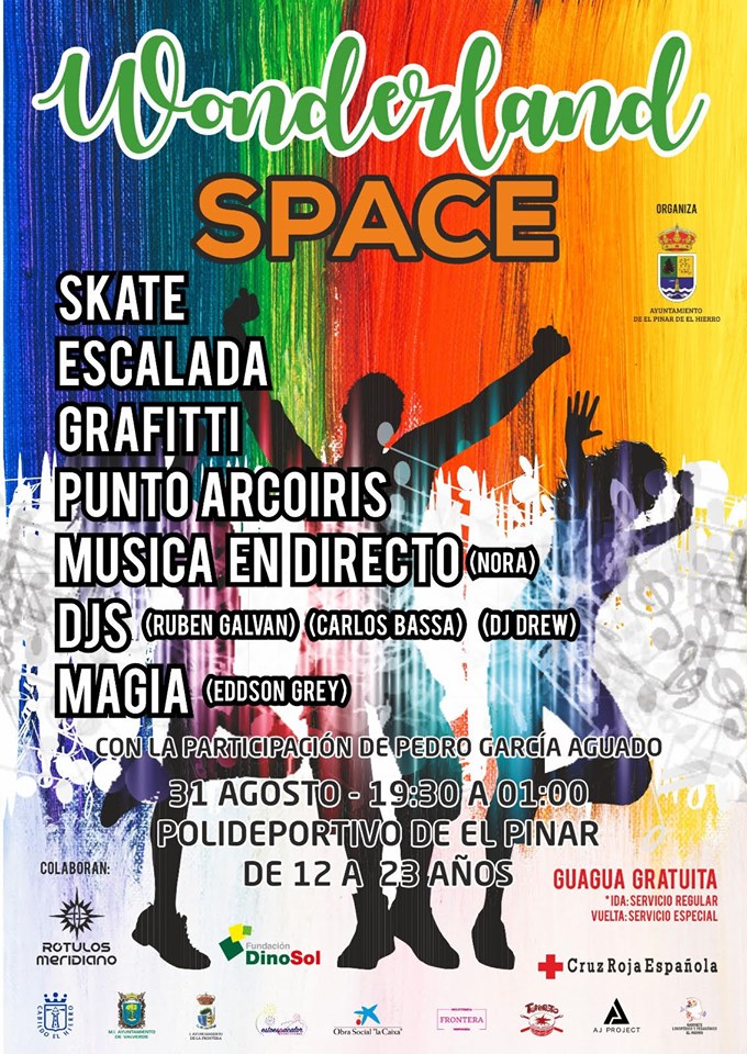 Redacción/El Pinar de El Hierro acogerá el próximo 31 de agosto el Festival Wonderland Space, dirigido a jóvenes de entre 12 y 23 años y en el que se incluyen diversas actividades relacionadas con el skate, los graffiti, la magia, la escalada y los tatuajes de henna. Asimismo, los asistentes podrán disfrutar y bailar con las actuaciones de Nora, Rubén Galván, Eddson, Grey, DJ Drew y otros artistas aún por confirmar.