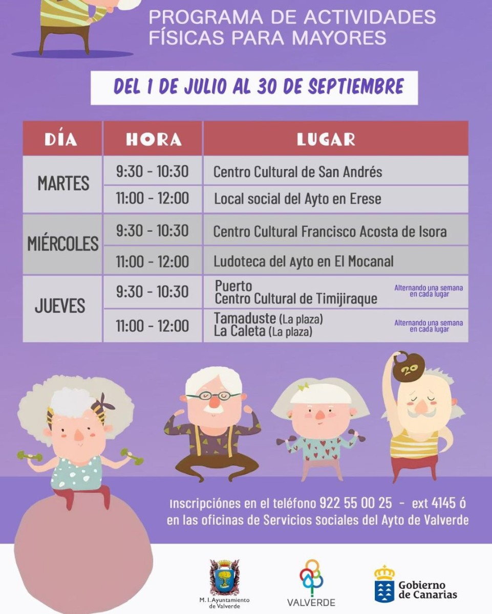 Las personas interesadas en los ejercicios, deberán inscribirse en los servicios sociales municipales llamando al teléfono 922 55 00 25 extensión 4145, o, acudiendo directamente a los lugares que se detallan en el cartel.
