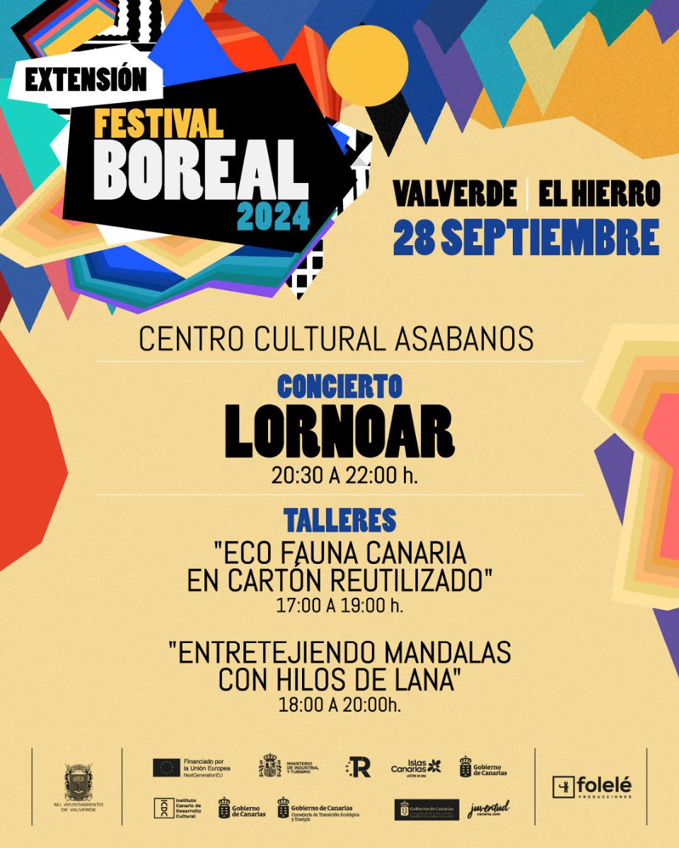 A partir de las 17:00 y hasta las 22:00 horas, en el Casino de Valverde, en la Villa capitalina, se desarrollarán dos talleres de sensibilización ambiental para toda la familia a través del arte y de interculturalidad, “Eco-fauna canaria en cartón reutilizado” y “Entretejiendo mandalas con hilos de lana”. Posteriormente, la excepcional artista camerunesa Lornoar ofrecerá un recital en el que desplegará su repertorio musical y grandeza compositiva e interpretativa.
