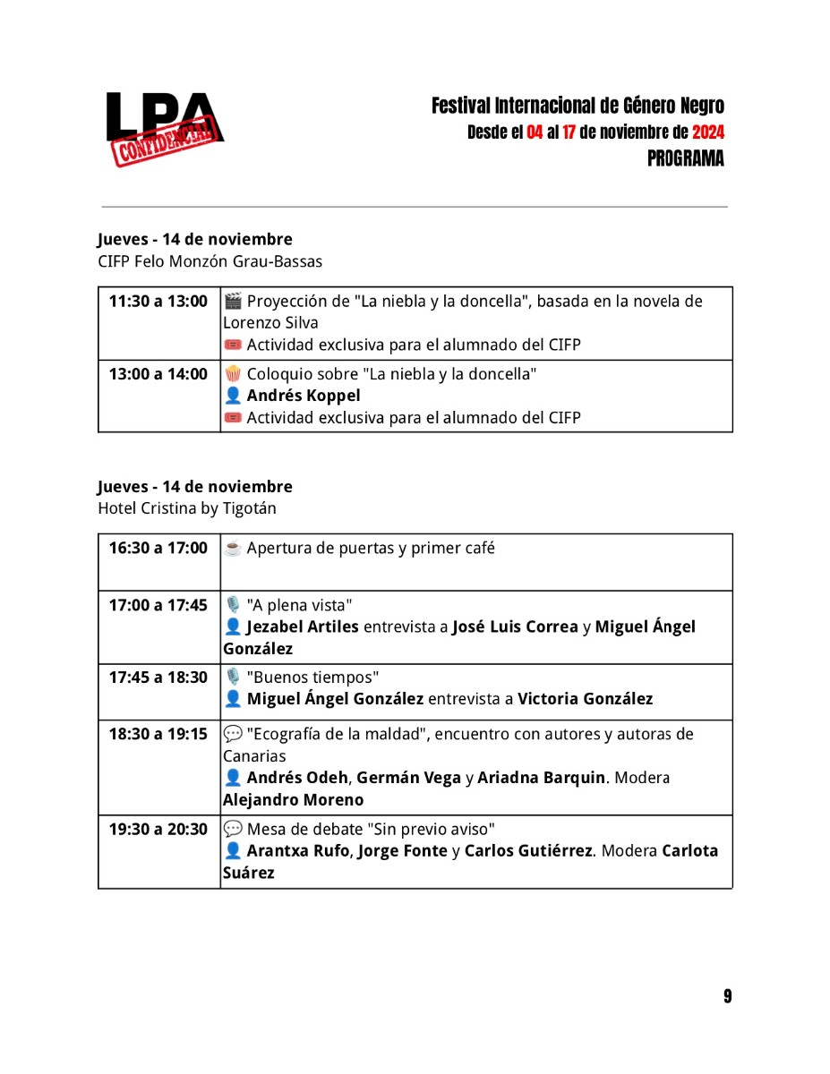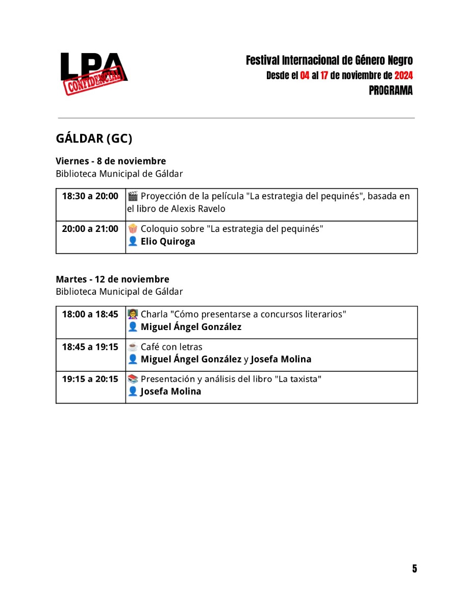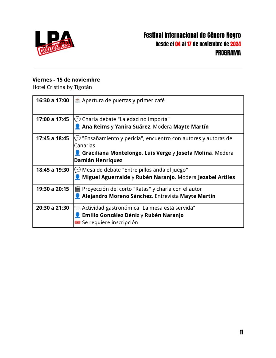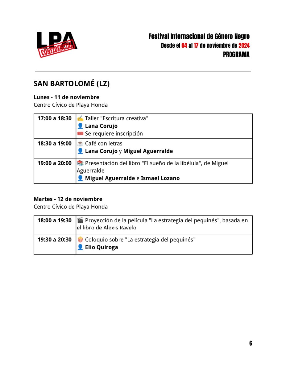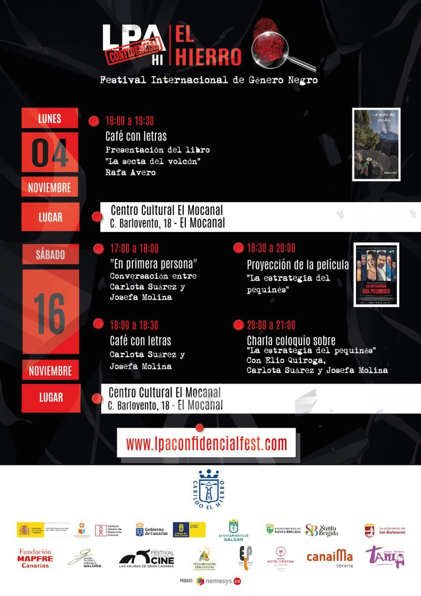 El festival continuará en El Hierro, el sábado, 16 de noviembre, en el Centro Cultural El Mocanal, con una sesión de café con letras a cargo de Carlota Suárez y Josefa Medina, y la proyección y posterior coloquio de la película “La estrategia del pequinés”, basada en la novela de Alexis Ravelo.