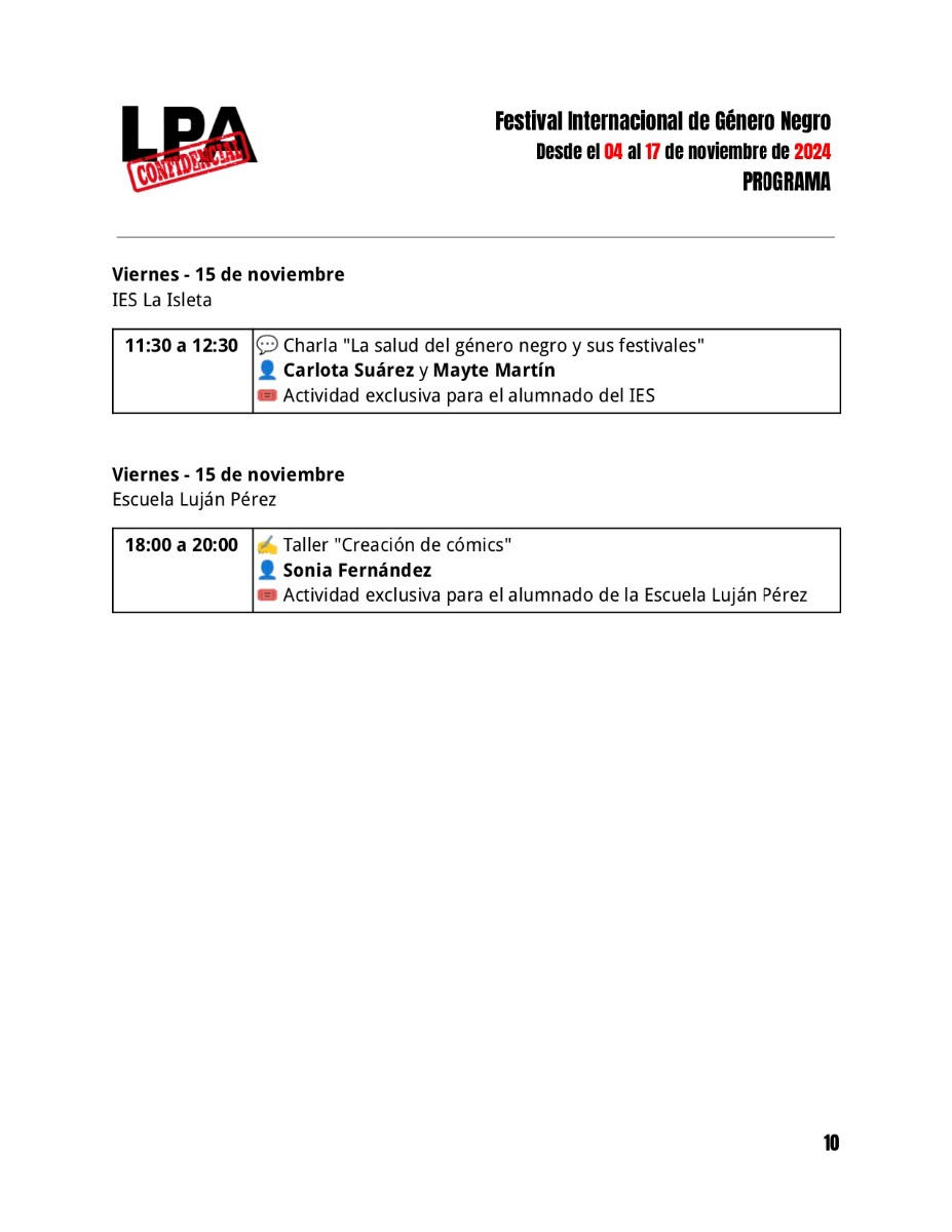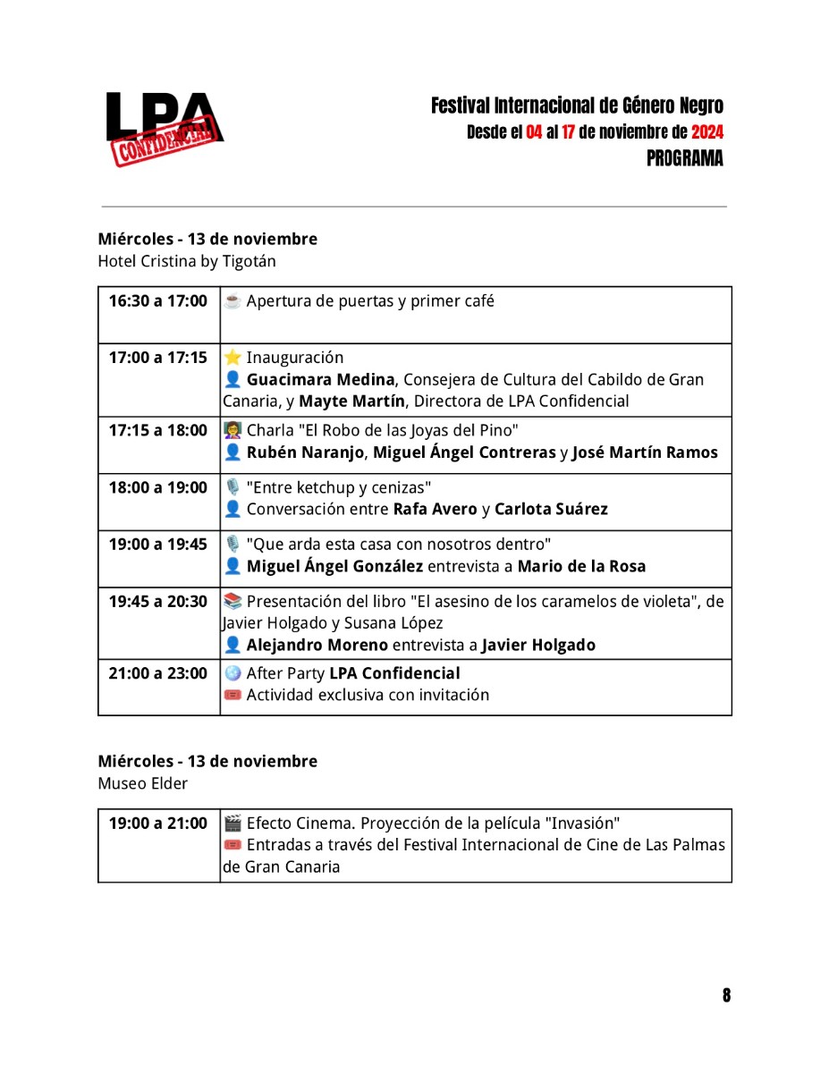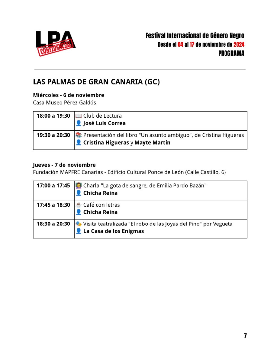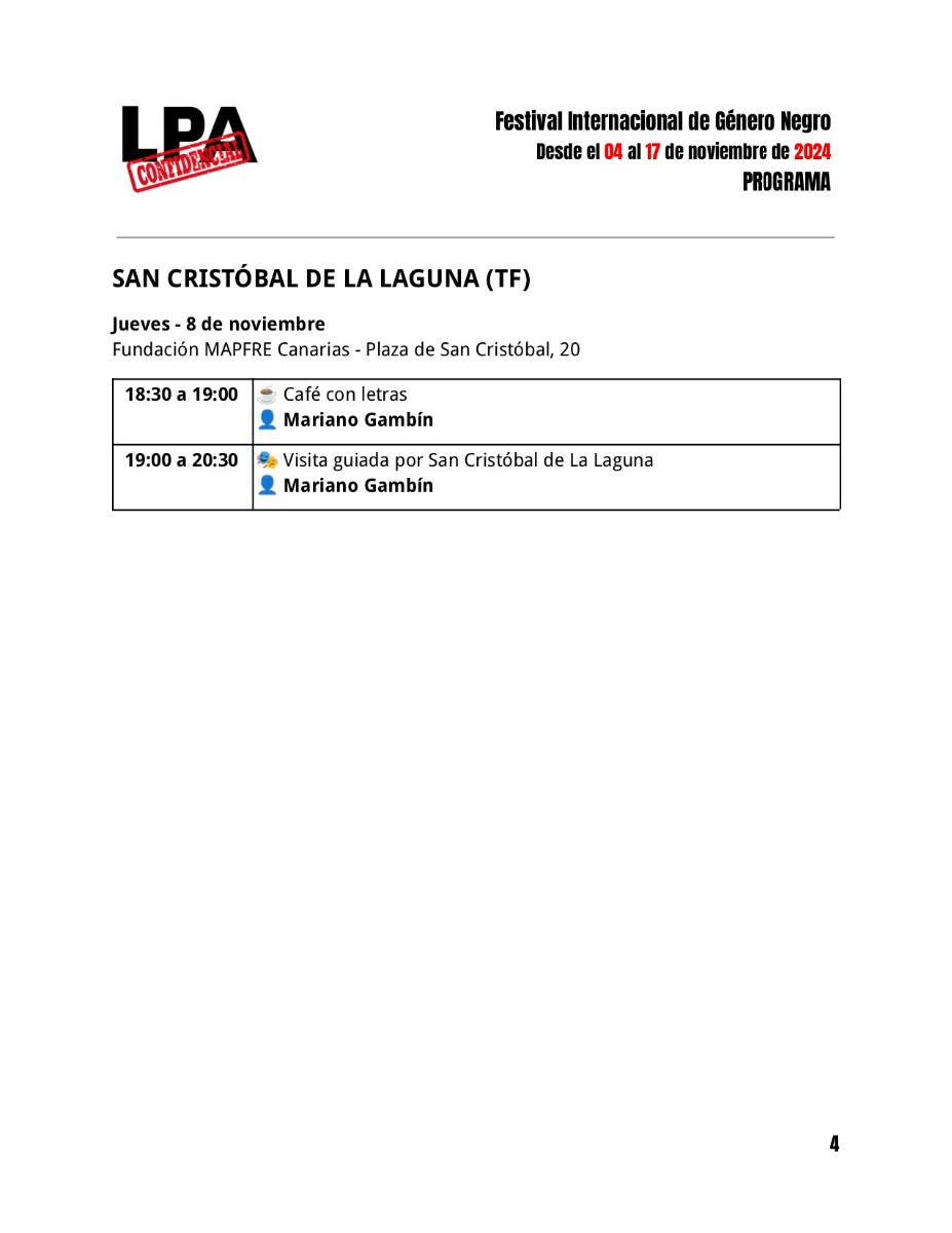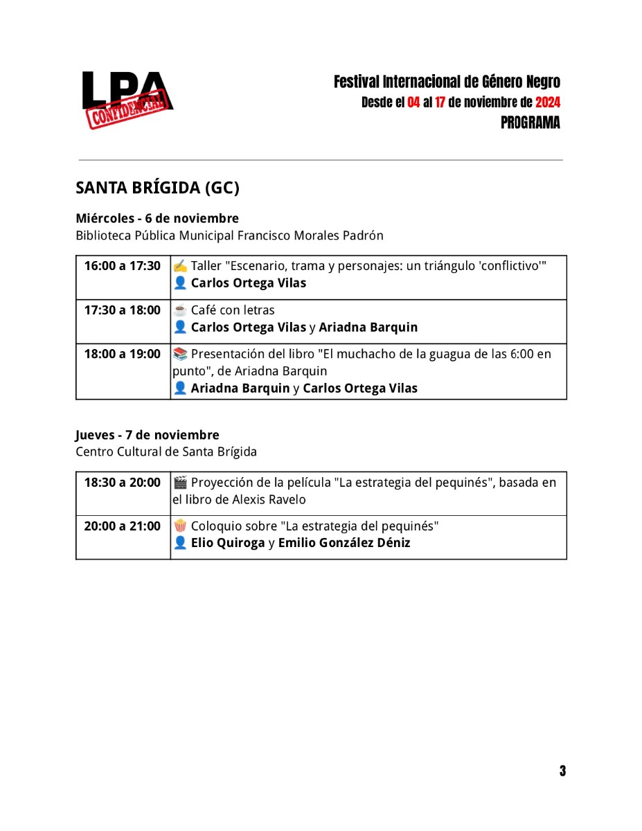 El festival continuará en El Hierro, el sábado, 16 de noviembre, en el Centro Cultural El Mocanal, con una sesión de café con letras a cargo de Carlota Suárez y Josefa Medina, y la proyección y posterior coloquio de la película “La estrategia del pequinés”, basada en la novela de Alexis Ravelo.