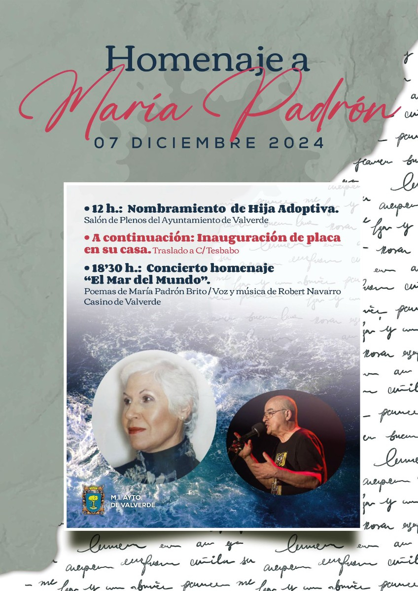Durante el acto, se nombrará a María Padrón Brito, Hija Adoptiva de Valverde. Tras el acto de nombramiento como Hija Adoptiva de Valverde, tendrá lugar el desvelado de una placa conmemorativa en el que fuera domicilio de la poeta y escritora, en la Calle Tesbabo.