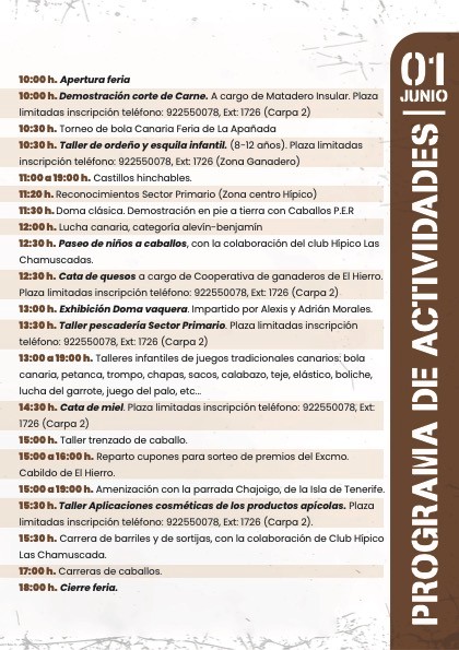 El domingo 1 de junio, la feria abrirá a las 10:00 horas con la exhibición de ganado, donde los criadores herreños mostrarán sus mejores ejemplares. Como novedad, se llevará a cabo una demostración de corte de carne a cargo del Matadero Insular. Talleres de ordeño y esquila para niños, exhibiciones de doma vaquera y clásica, lucha canaria, catas de miel y queso, y actividades dedicadas al sector pesquero y apícola.