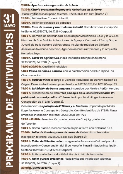 El sábado, 31 de mayo, a las 11:00 horas, tendrá lugar la apertura e inauguración de la muestra agroalimentaria y artesanal, dando paso a dos días en los que la cultura ganadera y pastoril de la isla será la protagonista. Tras la jornada inaugural, la feria continuará con la presentación del proyecto de apicultura de El Hierro, seguida de talleres y actividades infantiles como el torneo de bola canaria, el taller de trenzado de caballos y una cata de queso y mermeladas especialmente pensada para los más pequeños.