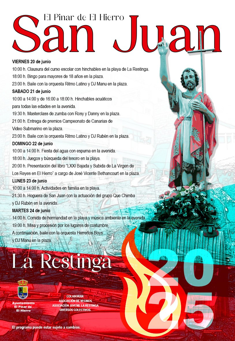 La programación comienza el próximo viernes 20 de junio, a las 10:00 horas, con la clausura del curso escolar, con hinchables en la playa de La Restinga, para los más pequeños. A las 18:00 horas, se celebrará un bingo para mayores de 18 años en la plaza de la localidad. La jornada culminará con una gran noche de baile, a las 23:00 horas, con la actuación de la orquesta Ritmo Latino y DJ Manu.