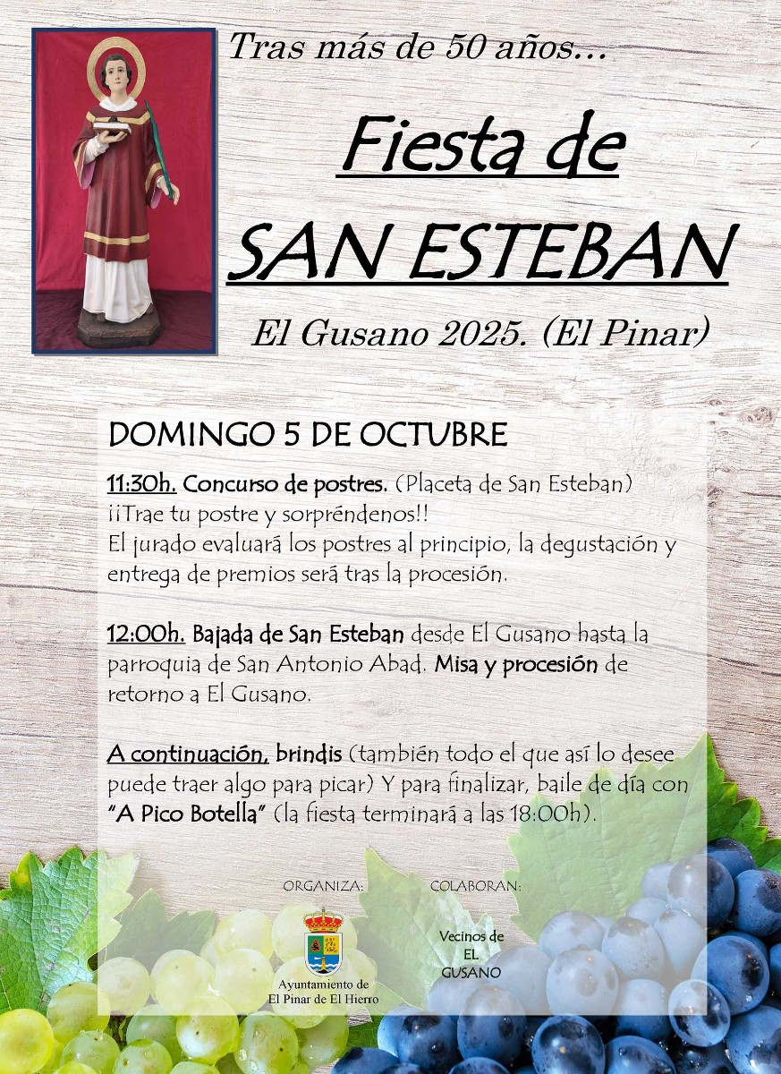 A las 12:00 horas, dará comienzo la bajada de la imagen de San Esteban desde la placeta de San Esteban, en El Gusano, hasta la parroquia de San Antonio de Abad, donde se celebrará la misa, para, posteriormente, regresar a la placeta de San Esteban.
