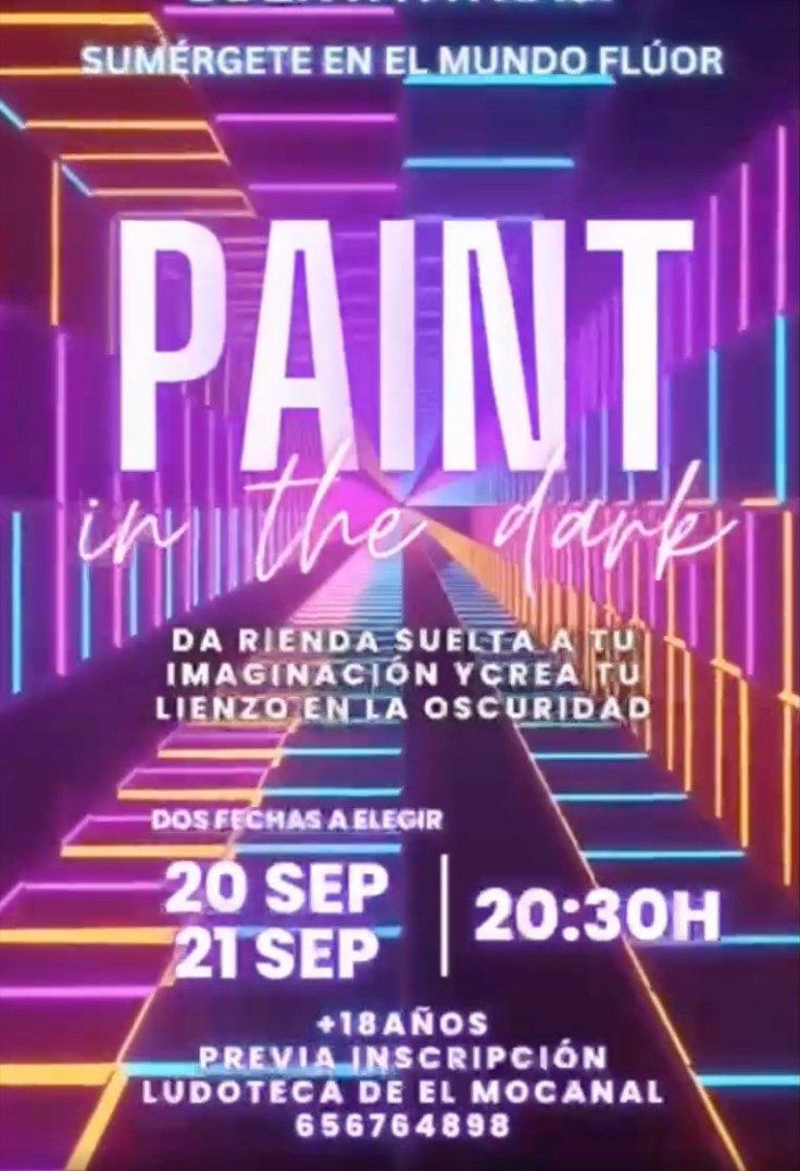 Sumérgete en un ambiente mágico y oscuro, iluminado con luces de neón. Taller de pintura y música ambiente.