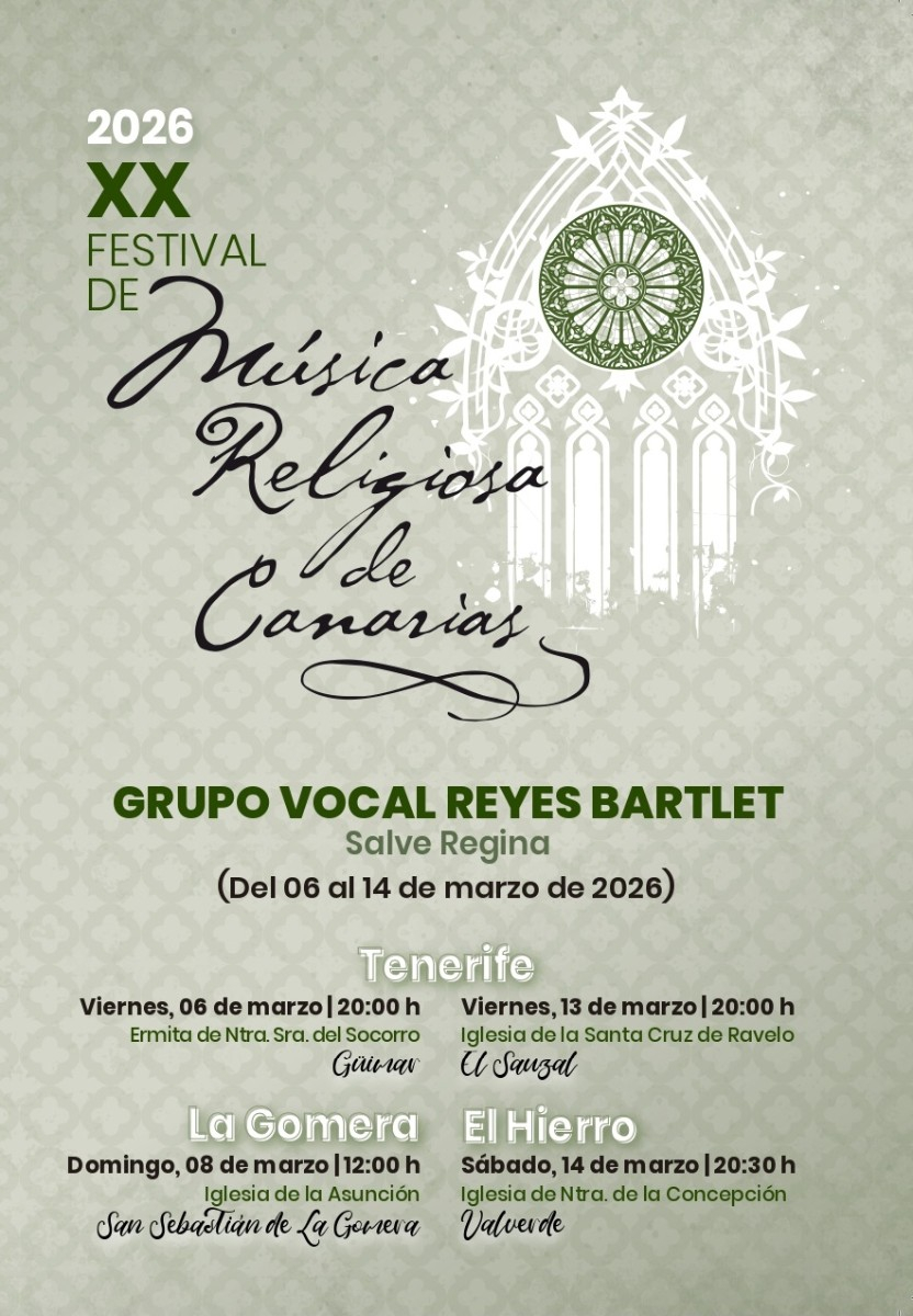 El Grupo Vocal Reyes Bartlet, de Puerto de la Cruz, dirigido por José Híjar Polo, celebra más de una década de trayectoria en la interpretación de repertorio sacro y polifonía renacentista con el programa Salve Regina, dedicado a la figura de la Virgen María, a través de obras de Francisco Guerrero, Tomás Luis de Victoria, Monteverdi, Josquin Des Prez y otros maestros del Siglo de Oro.