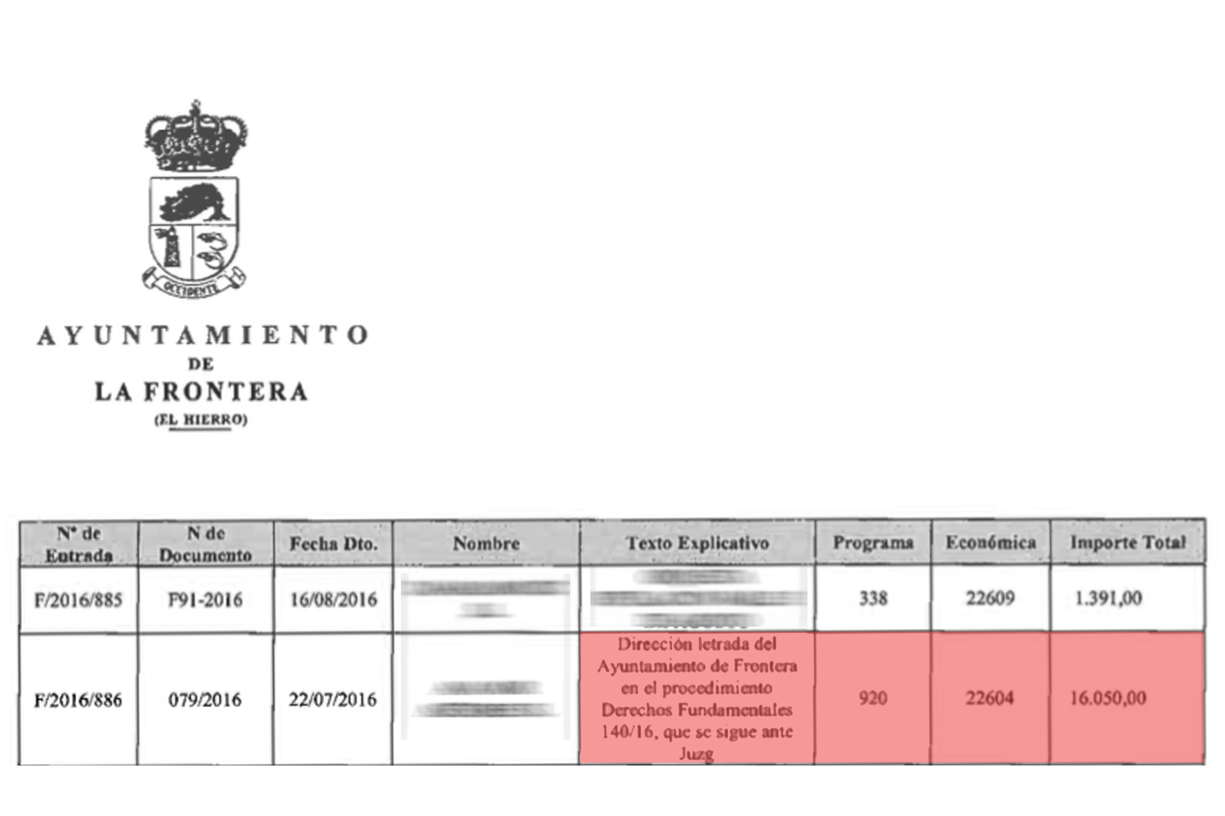 Los concejales de Unión Frontera en el Ayuntamiento de La Frontera, expresan que esta es una muestra más de la falta de transparencia del actual Grupo de Gobierno, que no entiende que dificultades existen para explicar un gasto de 16.050 euros denominado: “Dirección letrada del Ayuntamiento de Frontera en el procedimiento Derechos Fundamentales 140/16 que se sigue ante juez” por parte del Grupo de Gobierno.