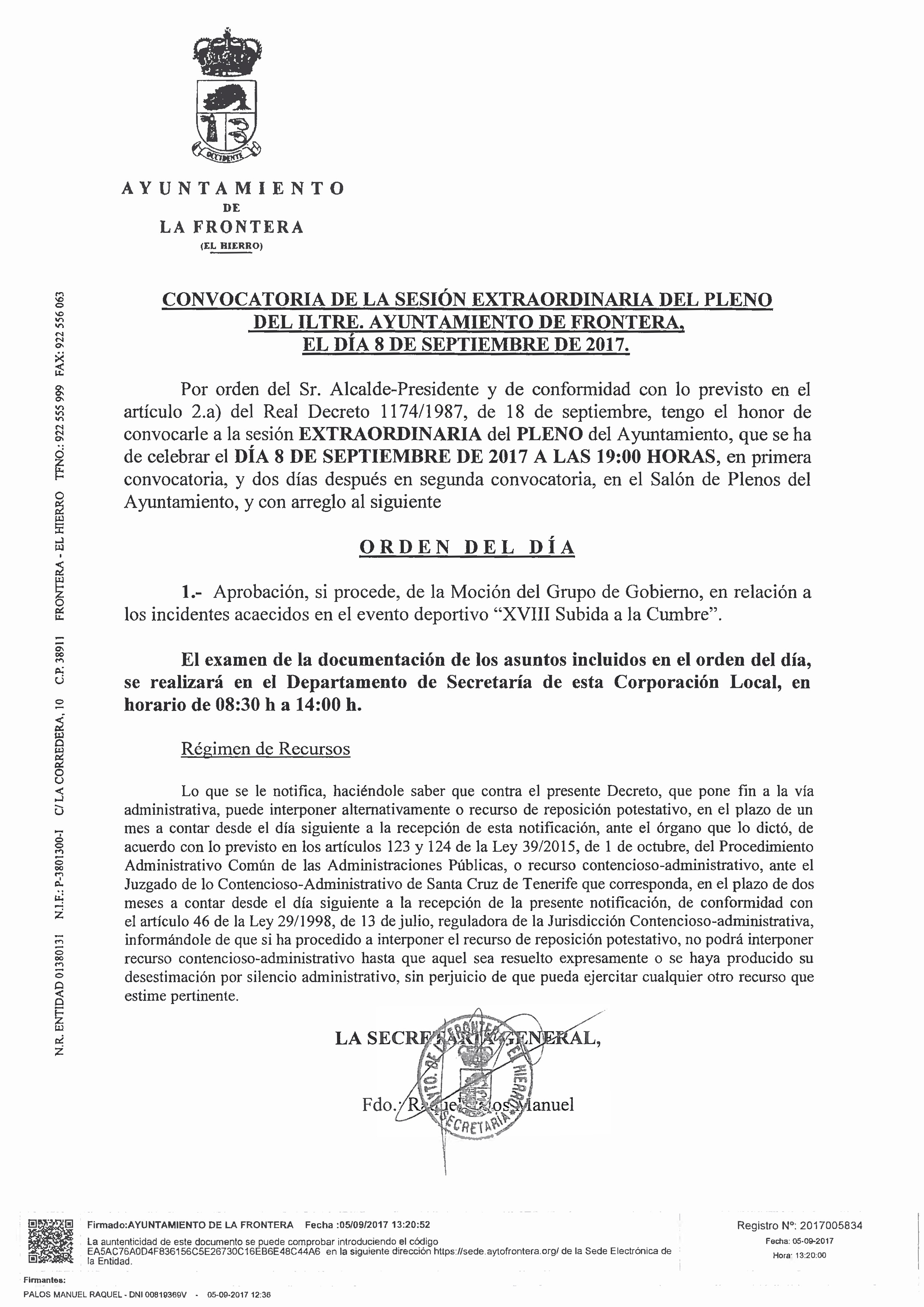 Redacción/El Ayuntamiento de La Frontera, celebrara hoy viernes, 8 de septiembre, a las 19:00 horas, el salón de plenos municipal un Pleno extraordinario con un único punto del día: