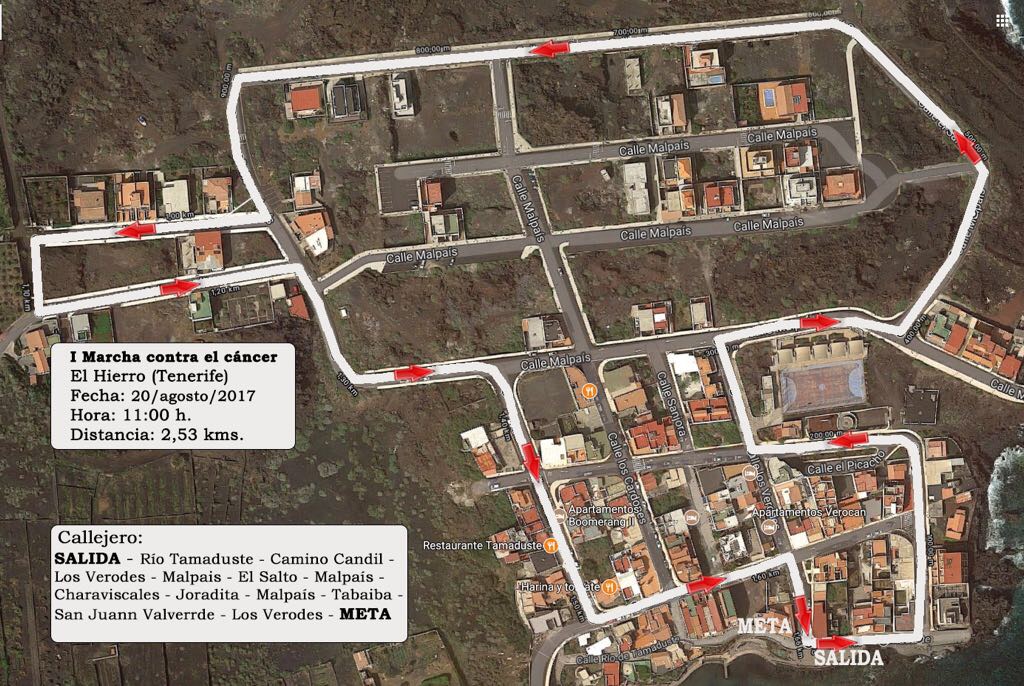 La prueba deportiva comenzará a partir de las 11:00 horas en la plaza del Tamaduste, que también será el punto de llegada, y discurrirá por el Camino Candil, calle Los Verodes, Malpaís, El Salto, Malpaís, Charaviscales, Joradita, Malpaís, Tabaiba, San Juan Valverde, y Los Verodes hasta llegar a la meta. En total, el recorrido será de unos 2,5 kilómetros que también se podrá realizar andando.