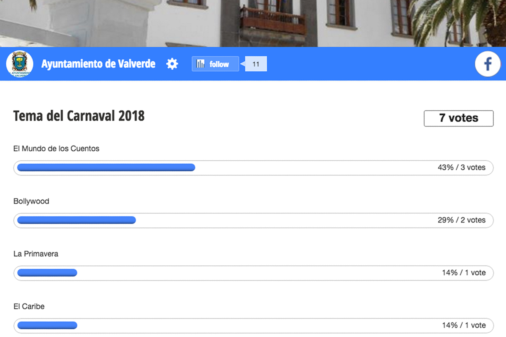 Redacción/El Ayuntamiento de Valverde ha abierto el plazo para elegir el tema del Carnaval 2018 a través de su página oficial de Facebook, a través de la cual los vecinos podrán elegir entre cuatro propuestas presentadas. Los interesados pueden escoger, hasta el próximo 13 de octubre, una de las cuatro alegorías a través de la página de Facebook del Ayuntamiento capitalino.
