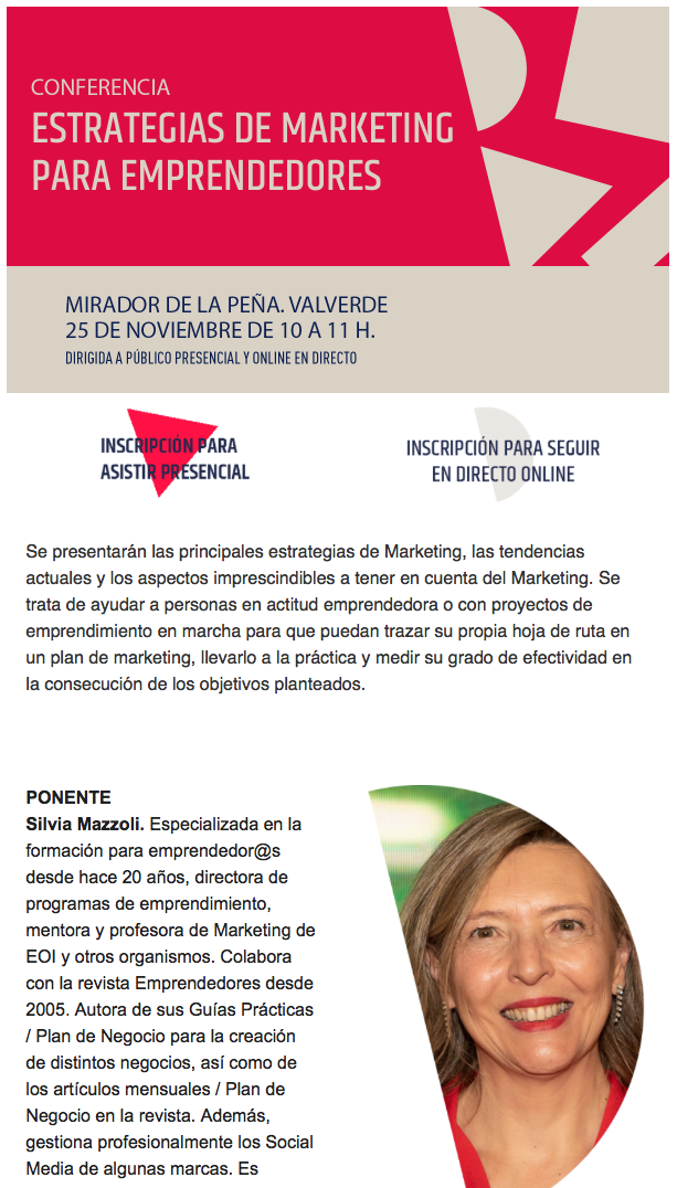 Se presentarán las principales estrategias de Marketing, las tendencias actuales y los aspectos imprescindibles a tener en cuenta del Marketing. Se trata de ayudar a personas en actitud emprendedora o con proyectos de emprendimiento en marcha para que puedan trazar su propia hoja de ruta en un plan de marketing, llevarlo a la práctica y medir su grado de efectividad en la consecución de los objetivos planteados.