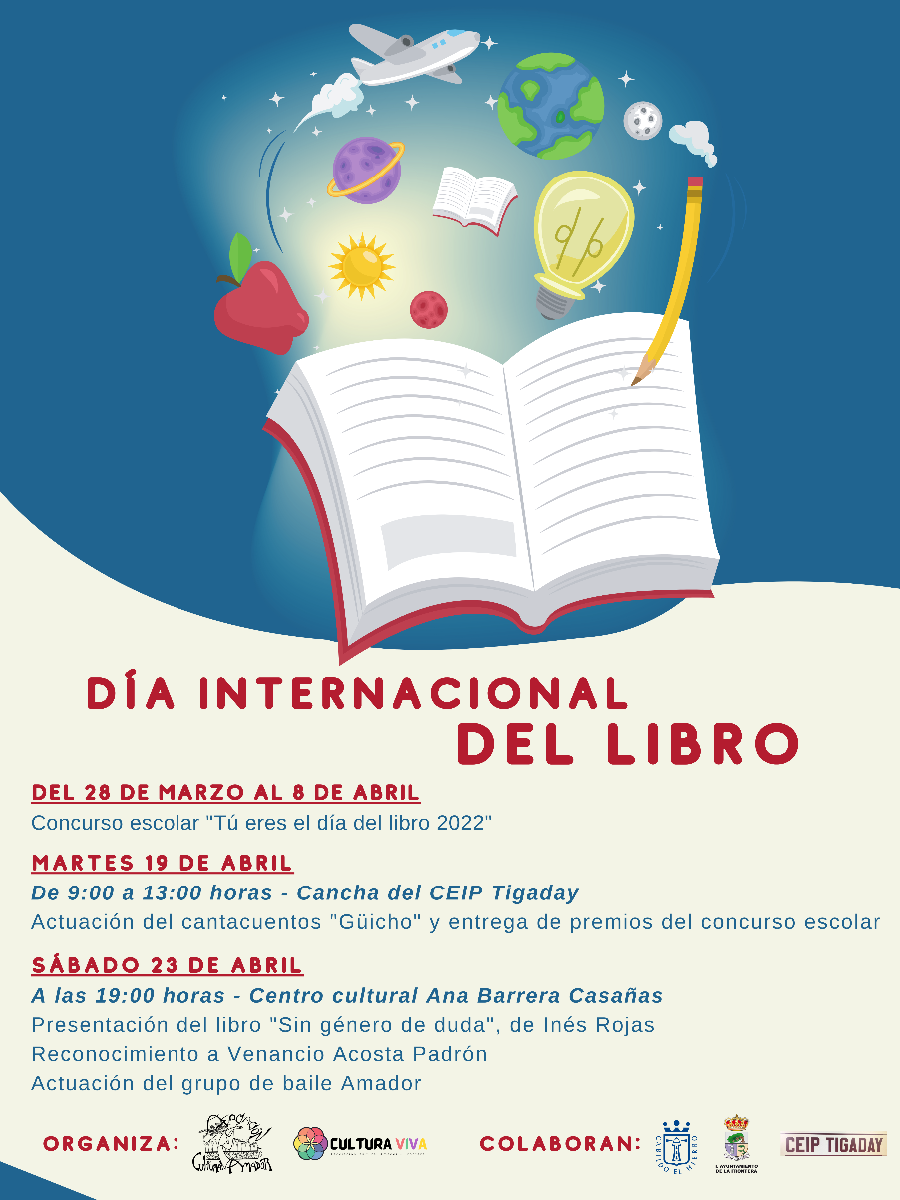 La entrega de premios se llevará a cabo el martes, 19 de abril, en el CEIP Tigaday, en una de las actividades que la Asociación cultural Amador llevará a cabo con motivo del día del libro. El sábado 23 de abril se desarrollará el ya tradicional acto conmemorativo del Día Internacional del Libro en la cancha del centro cultural Ana Barrera Casañas de La Frontera, en el que participará el grupo de baile Amador, que homenajeará este año la trayectoria de D. Venancio Acosta Padrón y se desarrollará la presentación del libro “Sin género de duda”, de la escritora lanzaroteña Inés Rojas.