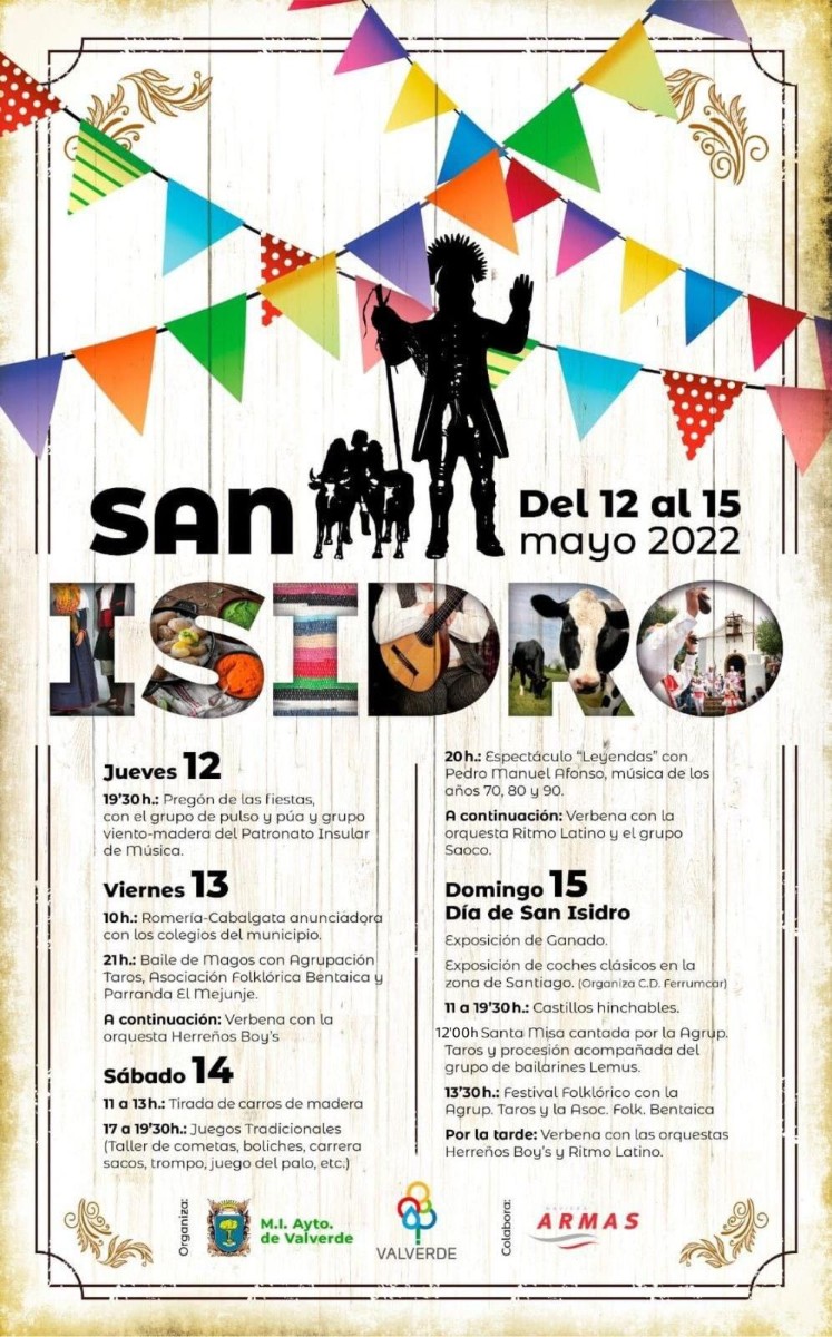 El domingo, 15 de mayo, tendrá lugar la Romería de San Isidro, prospección de la imagen por las calles de la Villa de Valverde, exposición de ganado, festival folclórico con la agrupación Taros, Asociación Folklórica Bentaica y verbena con las orquestas Herreños Boys y Ritmo Latino.