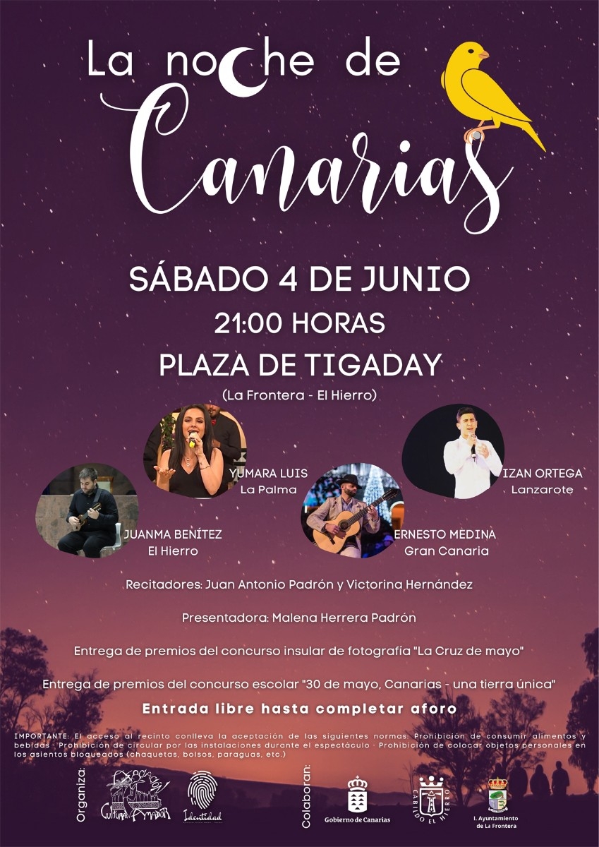El timplista herreño Juanma Benítez, el guitarrista grancanario Ernesto Medina y las voces de Yumara Díaz, de La Palma, e Izan Ortega, de Lanzarote, junto a Victorina Hernández y Juan Antonio Padrón realizarán un viaje poético-musical por las ocho islas. El acto será presentado por Malena Herrera Padrón.