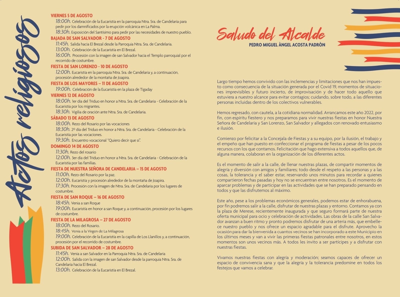 El consistorio ya ha viene desarrollado desde finales de julio, actividades y eventos que se extenderán durante todo el mes de agosto, con una programación que incluye un amplio abanico de actos y actividades culturales, deportivas y lúdicas para niños, jóvenes o mayores. A las galas de Elección Infantil y Juvenil a Rey y Reina de las Fiestas se suman los tradicionales días de San Salvador, San Lorenzo o Candelaria; las verbenas y el baile de Magos; además del Día de la Juventud o la Luchada de Los Camioneros; entre otros. Unas festividades que son punto de encuentro para todos los vecinos, con un programa para todos los públicos.
