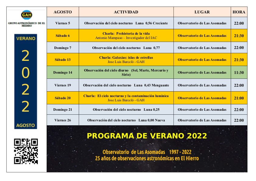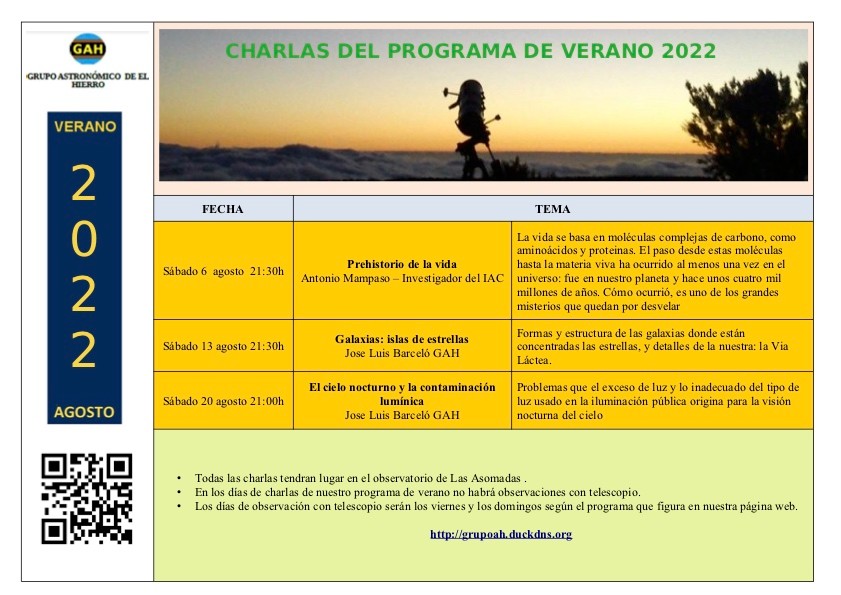 La primera charla tendrá lugar al día siguiente, el sábado 6 de agosto, también en el observatorio herreño, a las 21:30 con el título “Prehistoria de la vida”. Esta primera charla del programa a cargo de Antonio Mampaso, investigador del Instituto de Astrofísica de Canarias.