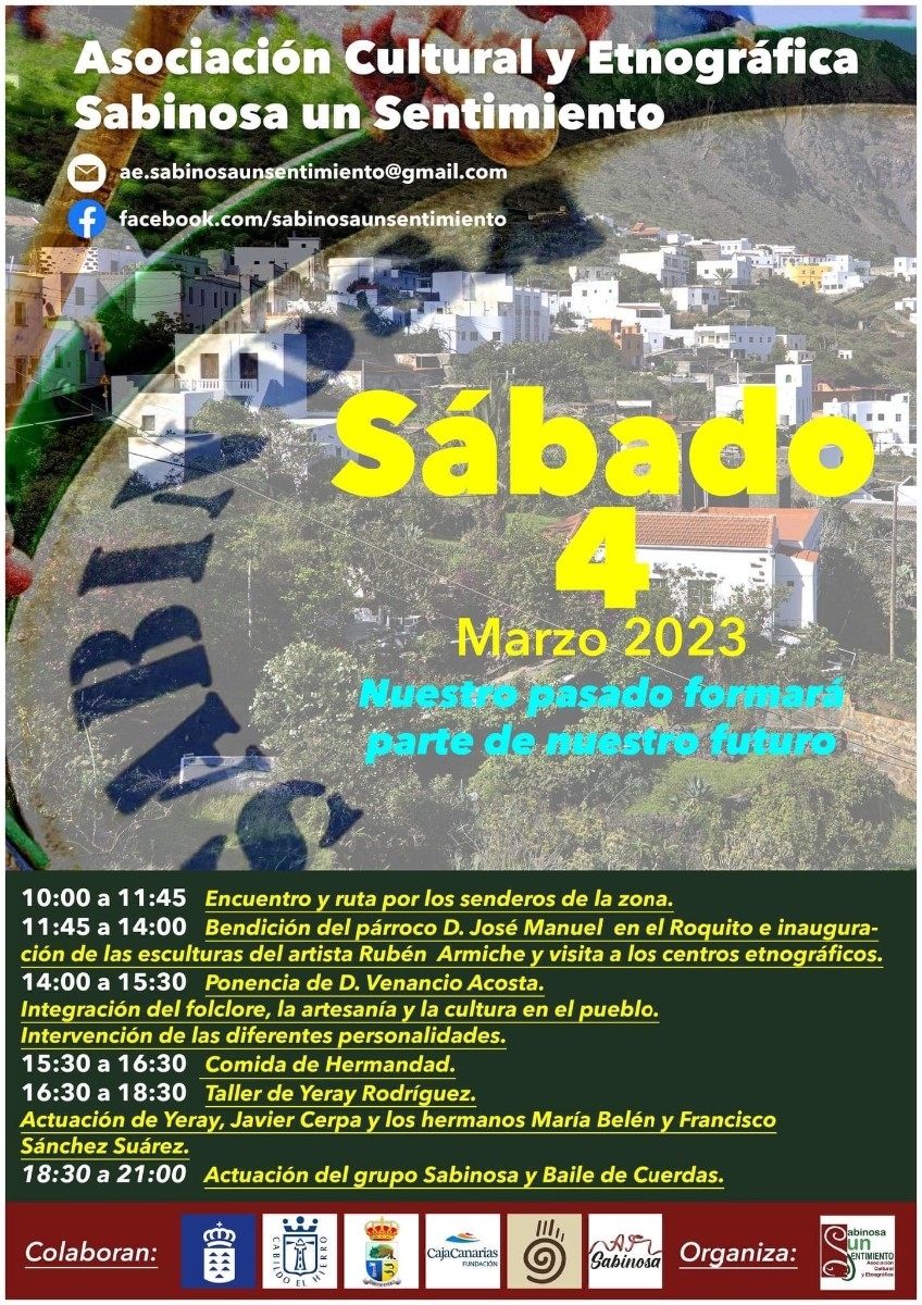 La jornada se iniciará a las 10:00 horas, con un encuentro que marcará el punto de salida a los senderos del pueblo de Sabinosa, que han ido rehabilitándose; posteriormente en la zona de El Roquito en la entrada del pueblo, se presentaran las esculturas elaboradas por el artista herreño Rubén Armiche, y se realizaran las visitas guiadas a los centros etnográficos que la asociación ha ido recuperando como la antigua tienda de ultramarinos, la carpintería y talleres artesanos, de esta localidad.
