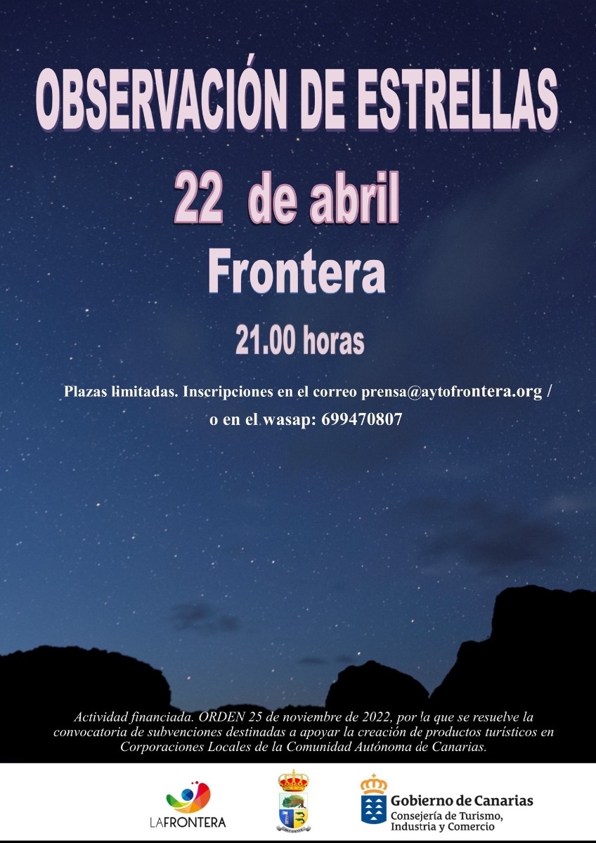 El Ayuntamiento de La Frontera ha abierto el plazo de inscripción para la actividad de "Observación de estrellas", prevista para el 22 de abril, a las 21:00 horas.