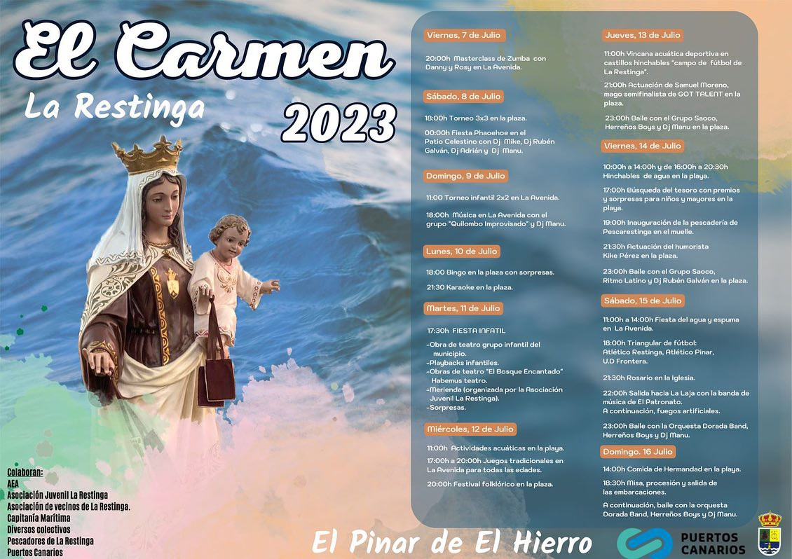 El sábado 15 de julio, de 11:00 a 14:00 horas, los residentes y visitantes podrán disfrutar de la fiesta del agua y espuma en la Avenida. A las 18:00 horas, el Atlético Restinga, Atlético Pinar y U.D. Frontera disputarán un triangular de fútbol y a las 21:30 horas habrá rezo del Rosario en la iglesia, y a las 22:00 horas salida hacia La Laja con la banda de música de El Patronato. A continuación, fuegos artificiales. La Orquesta Dorada Band, Herreños Boys y Dj Manu, pondrán a bailar a los asistentes a las 23:00 horas. El programa de actividades de las Fiestas del Carmen finalizará el domingo 16 de julio, con la tradicional comida de Hermandad en la playa de La Restinga a las 14:00 horas, a las 18:30 horas tendrá lugar la Misa, procesión y salida de embarcaciones. A continuación, baile con la Orquesta Dorada Band, Herreños Boys y Dj Manu.