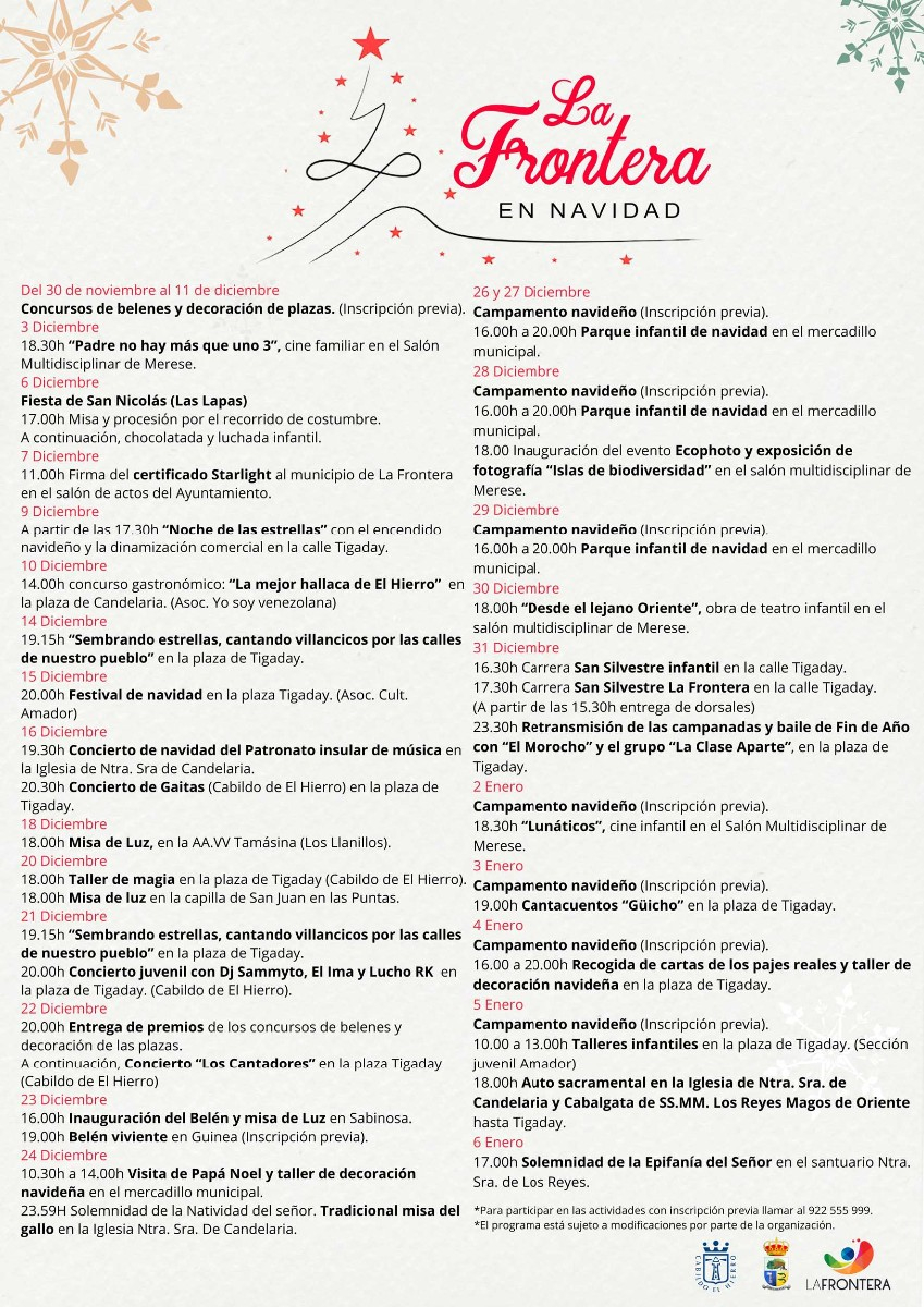 El 16 de diciembre tendrá lugar, en la plaza Tigaday, el concierto de “Gaitas Venezolanas” y la Iglesia Candelaria acogerá el Concierto de Navidad que del Patronato Insular de Música de El Hierro; El 20 de diciembre, la plaza de Tigaday acoge un taller de Magia a las 18:00 horas y el 21 de diciembre, un concierto juvenil; El 22 de diciembre, en la plaza de Tigaday, tendrá lugar el concierto de “Jóvenes Cantadores” y la entrega de Premios de los concursos de Belenes y de Decoración de plazas; El 23 de diciembre, se desarrollará el Belén Viviente del poblado de Guinea.