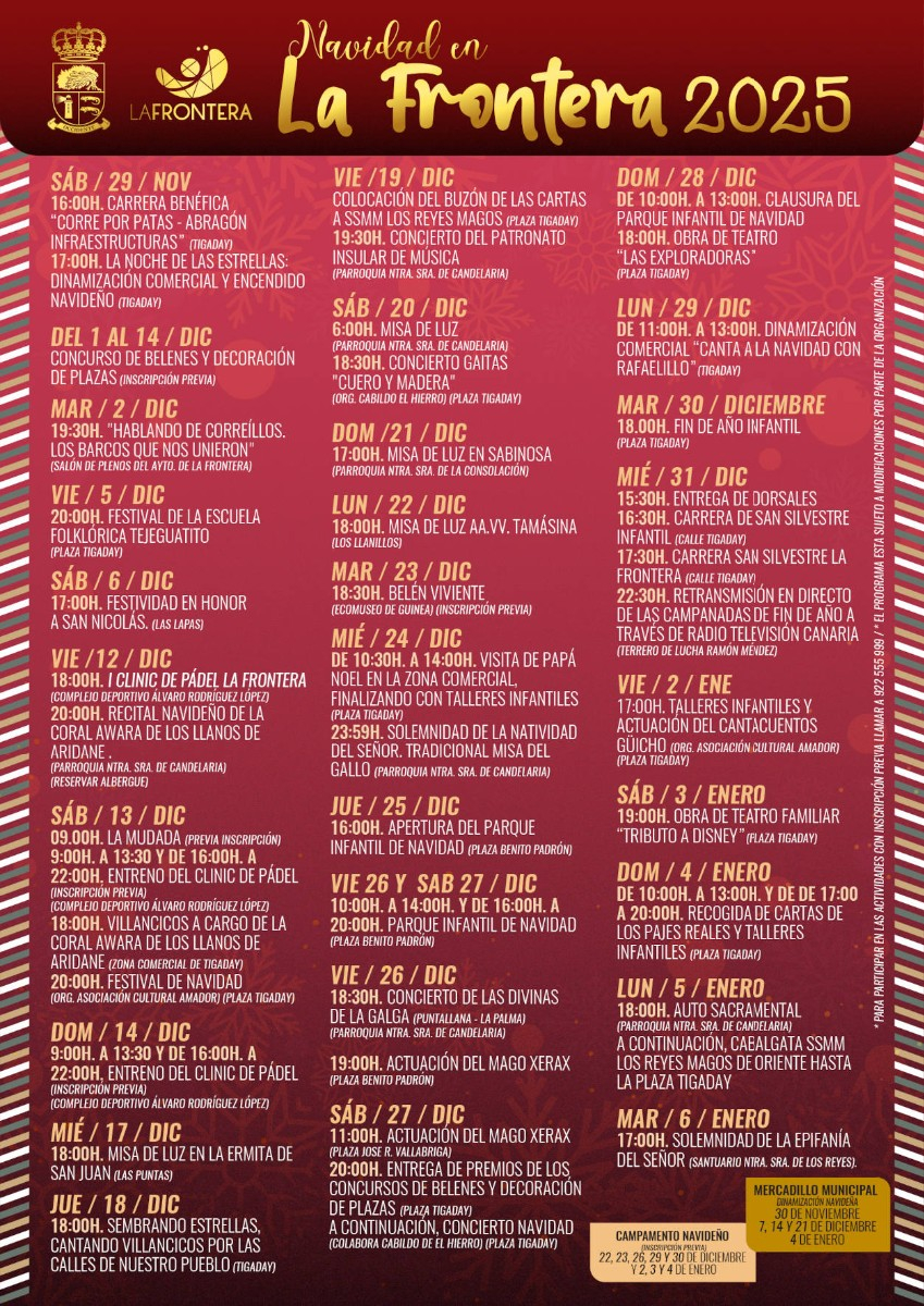 El Parque Infantil de Navidad se celebrará del 25 al 28 de diciembre, en la plaza Benito Padrón, mientras que el Belén Viviente en el poblado de Guinea tendrá lugar el 23 de diciembre. El calendario incluye también la entrega de premios de los concursos navideños de Belenes y decoración de plazas, el 27 de diciembre, acompañados por un Concierto de Navidad.